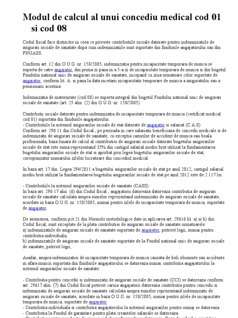 vizitati articolul complet aici : http://legislatie.just.ro/Public/DetaliiDocument/197459 Conform legii, certificatele de concediu. Legislatia aplicabila in cazul calcularii si inregistrarii concediilor medicale: Reglementari in codul muncii concediu medical.