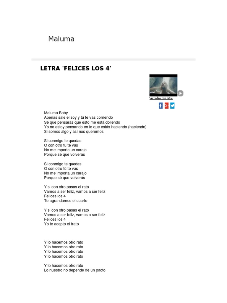 Nghe online bài hát felices los 4 do ca sĩ maluma thể hiện. Original lyrics of felices los 4 song by maluma. 2.2k reads 69 votes 8 part story.