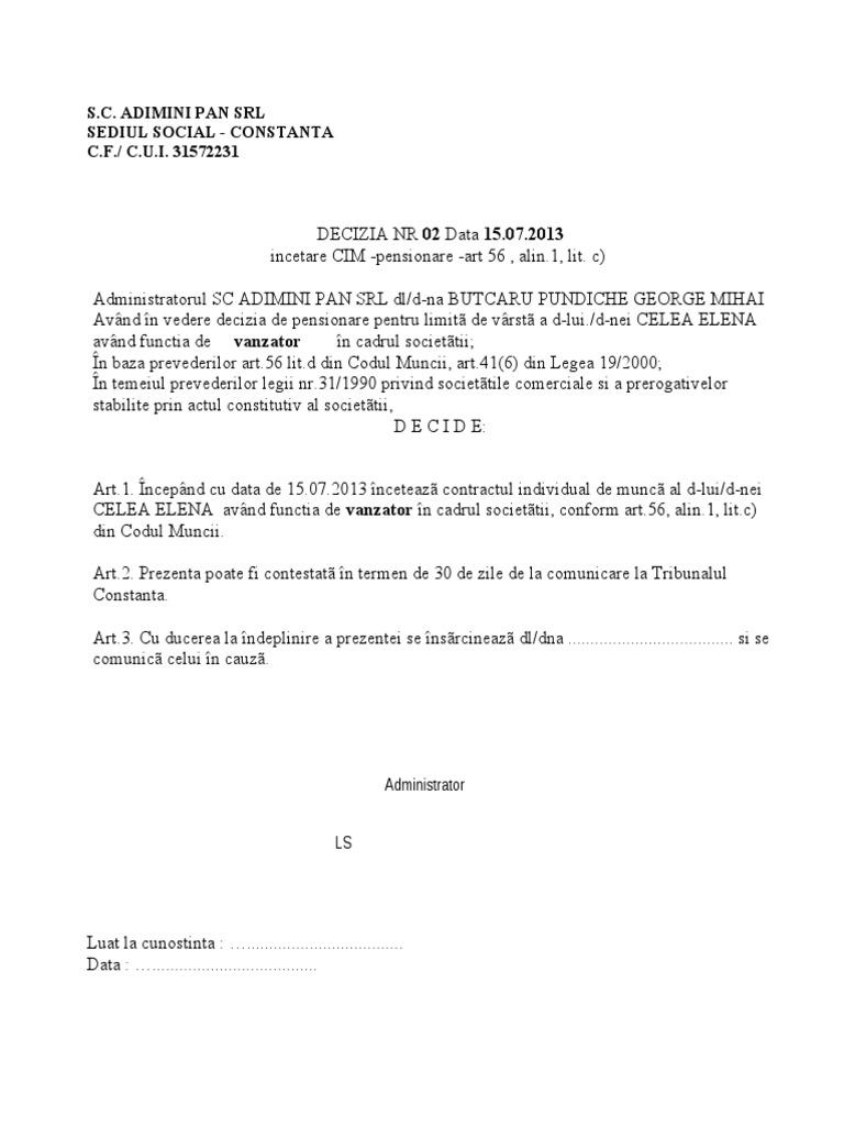 ocalin by alin009, visual art. Cazul de incetare a contractului individual de munca stipulat de art. Model de decizie incetare cim conform art.