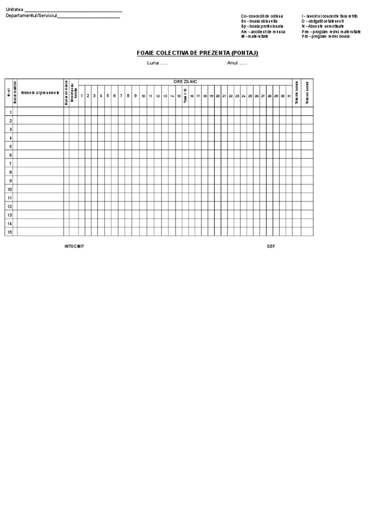 Cumul de functii contabil cu inspector resurse umane. Document folosit in unele sisteme de evidenta a prezentei la program, in decursul unei luni, a angajatilor pe care, cu ajutorul ceasului de pontaj pontaj se afla, in luna cand este utilizata pentru inregistrarea, pe un panou de pontaj. Foaie colectiva de prezentape luna :