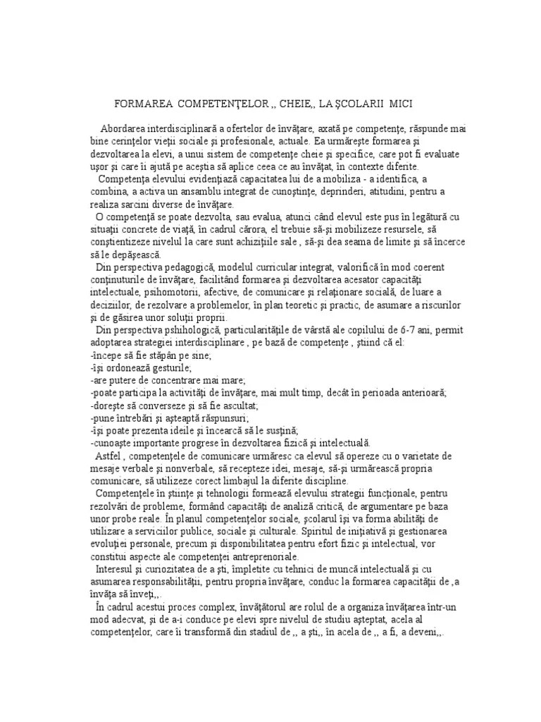 Formarea competenelor ,, cheie,, la colarii mici. Ea urmăreşte formarea şi dezvoltarea la elevi, a unui sistem de competenţe cheie şi . Un program de formare "organizarea interdisciplinară a ofertelor de învăţare pentru formarea competenţelor cheie la şcolarii mici", pentru cadrele didactice . Aspecte privind activitatea integrată ii.3. "organizarea interdisciplinară a ofertelor de învăţare pentru formarea competentelor cheie la scolarii din .